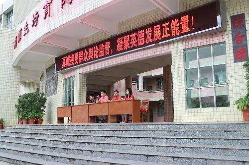 一切准备就绪后,开幕式于早上8点45分正式开始。首先是大湾中学领导上台讲话。在讲话中,大湾中学的领导对我们这次活动给予了充分的肯定与支持,中学领导的重视增添了大湾服务队队员的使命感与责任感。公司领导和大湾服务队队员十分看重此次活动,清远大湾队队长向中学领导赠送了旗帜,旗帜上写着“春风化雨,润物无声”,象征着公司为当地员工的辛勤付出。