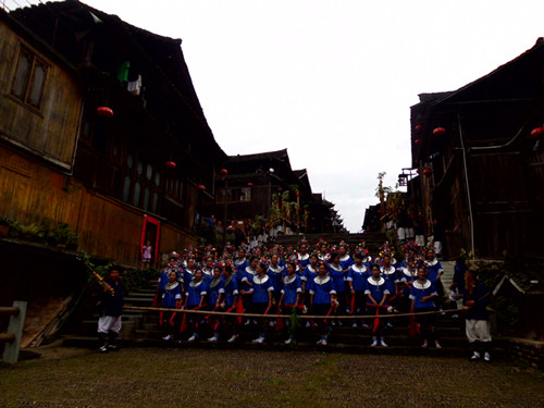 值得一提的是,大队人马初到寨门前时,侗乡父老以对歌的形式,来考验服务队等的歌唱水准。假如对歌对不上,侗乡父老就会用横放着的竹竿以示困扰宾客进侗寨。广外大水粤侗天服务队的带队老师苏春,以她优美的嗓子,用侗歌对唱,最终博得侗乡父老的高声称赞。苏春老师原是三江人,她爱好歌唱,兴趣甚广,侗歌对唱,这才为来宾解围,破除进入侗寨的门槛。