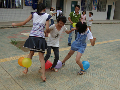 气球爆裂的“啪”、“啪”的声音和孩子们的激动地尖叫声回荡在中庭空地,这就是最吸引人眼球的就是踩气球游戏。男生和女生、小员工和初中生,都被这个游戏迷住了。孩子们尖叫着跑啊跳啊,既不愿意自己的气球被踩到,也要尽可能地去踩别人的气球。他们像斗鸡一样在空地里相互接近又飞快地跳开、伺机进攻又小心防守。场边观看的孩子们也乐得直拍手叫好,加上气球爆裂的声音和孩子们的尖叫声,这就是最好的“广告”,排队的孩子们越来越多。这可忙坏了场外的老师们。吹气球、绑气球、剪绳子,老师们简直一刻也停不下来。欢乐的漩涡持续了一整个上午。