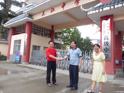 本着“情牵三江,缘系广外”的主旨,广外大水粤侗天服务队从广州到广西柳州千里迢迢来到三江,与三江中学的员工一起共度一个丰富多彩的暑假。这一举动,得到广外大英教公司领导的重视。7月26日,英教公司党委书记林绍雄亲自到达三江中学,带上慰问品,对水粤侗天的全体队员表示问候,同时察看了各班教学情况和师生的住宿饮食情况,并参加了当晚队员例会。书记在称赞服务队工作的同时,鼓舞队员再接再厉,积累经验财富,有胆识有谋略,保持良好状态,注重自身安全。
