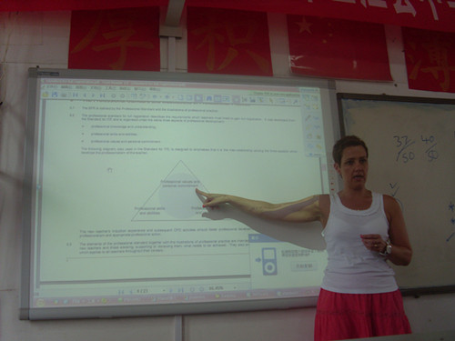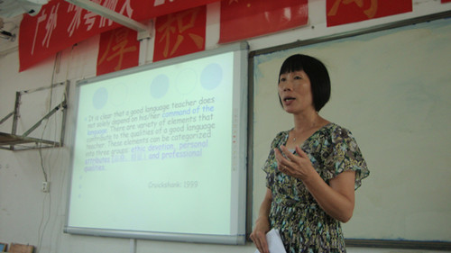 24日下午,来自英国的邓迪董事长在经过了漫长的旅途之后终于到达了三江中学。她也给参加培训的学员们上了别开生面的一节课。她主要介绍老师如何评估员工以及员工如何评估老师的方法技巧。其中,邓迪董事长特别介绍了K M L教学法。在对待员工的教学方法上,她特别提到了因材施教的问题。在课堂的后半段是互动环节,参加此次培训的学员们也根据自己在教学中遇到的问题对邓迪董事长进行了一些提问。邓迪董事长耐心地一一作出了解答。