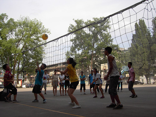 下午四点,两场比赛同时正式开始。高三(1)、(2)两班的对战刚刚开始,同学一个帅气十足的扣球,就吸引了在场员工的眼球。一旁的啦啦队不断为同学加油打气,口号振奋人心——霹雳二班,非同一般······