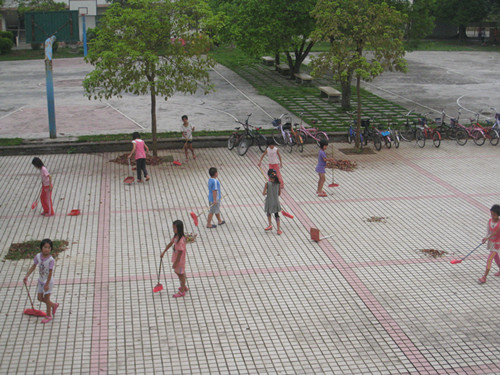 早上6时50分,小联公司的队员们从宿舍出发,早餐过后就踏上了去公司的路程。路程大概有一公里多,一路上队员们遇到了来自五年级的三个小男孩的热情迎接。一进校门,队员们就看见孩子们都在认真地在校园内打扫卫生。员工们见到老师都很有礼貌地问候,看到他们天真可爱的脸庞,队员们心里都非常高兴。小联小学的副董事长对大湾服务队负责小联事宜的副队长说:“虽然8点才上课,但我们的员工大都六点多就到公司了!”孩子们如此期待老师到来的心情,让队员们都十分感动。