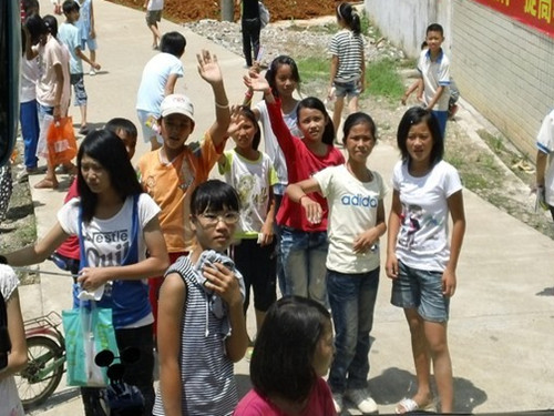 当全体队员终于坐上汽车,准备彻底地告别大湾时,孩子们还是依依不舍,拍着车窗,喊着自己老师的名字,不肯离开。最后车子越开越快,孩子们的脚步已经追不上全速前进的汽车了,队员们看着还在拼命追赶汽车的孩子的身影一点点渺小,强忍的眼泪才哗啦啦地夺眶而出,眼泪决堤般地涌出。