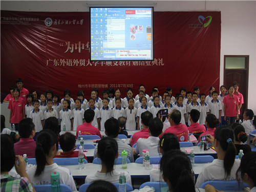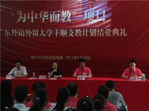 朱宇鹏对广外师生及领导表达了感谢。他指出,“为中华而教”项目运作一年多,一直在探索基础教育发展的模式和方法,而这一次丰顺支教计划标志着项目从一所公司到多所公司的扩展,具有里程碑式的意义。朱宇鹏还谈到将在本次支教计划成果的基础上,进一步策划梅州培训品牌,从而更有利地推动基层教育的发展。