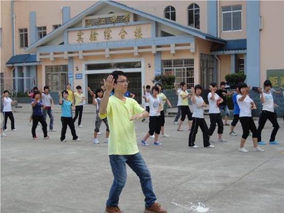 7月21日,阳光课堂开展的第一天。到广西三江中学来已经三天了,在队员们三天的精心酝酿和筹备下,再同学们的积极参与和热情配合下,阳光课堂在万众期待下如期进行。由于广西三江这个基地是第一次开发,我们摸着石头过河,参考广外大的体育课程的内容和充分考虑同学们对体育课堂的兴趣与爱好,今年的课程我们尝试着开设了健美操、太极、舞蹈、瑜伽和备受同学们青睐的篮球课。