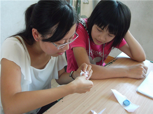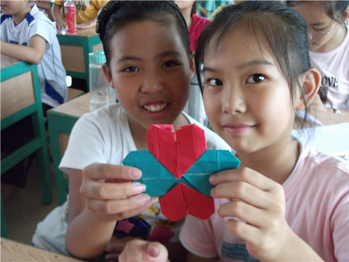 手工课接近尾声时,孩子们也都基本学会了折郁金香和四叶草,他们手上或精美或褶皱的小作品是努力学习的见证。令人感动的是,下课后,这群懂事可爱的孩子们纷纷将自己刚折出来的郁金香或四叶草送给了小老师们,那一句句充满爱心的“老师,这个送给你”让人倍感欣喜。