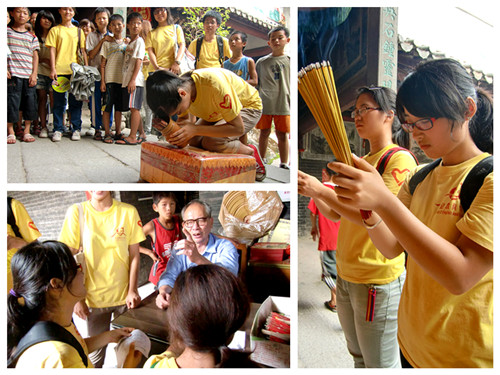 所谓入乡随俗,本着对宗教与信仰的开放态度与平等精神,部分组员虔诚地进行了参观和参拜。上香、跪拜、求签、敲钟、打鼓……处处流露着我们的敬意与理解。在庄严肃穆的祖庙里,队员们多日以来的疲惫以及烦恼随着纯白的烟一圈圈地氤氲开去了。队员们静静聆听着祖庙的佛歌,任由祖庙的灵气和氛围洗涤着自己的内心,并心静如水地当了一回信徒,在神灵面前虔诚地祈祷祝福。几个队员还承蒙上天厚爱求得了事业、爱情等方面的上签。虽说下乡是要普及科学文化,但是这无疑增强了大家对未来的向往及信心。