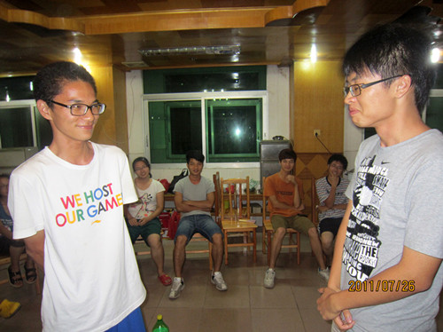 2011年7月26日晚,广外大三下乡清远大湾服务队在大湾中学的教师饭堂举行了激情又温馨的联欢会。三大猛男摇身变成可爱小熊、失传已久的MJ舞表演、搞笑版的天鹅湖男独舞、简单但令人感动的生日会以及刺激无比的真心话大冒险,让大湾队的33位队员在欢笑与紧张中进一步拉近了彼此间的距离。这一大家庭更和谐,更亲密了。