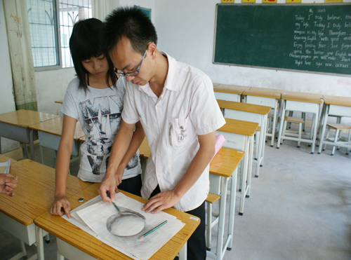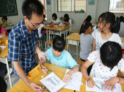 在这次下乡中,除了负责宣传方面的工作外,钟老师把所有的心思都投入到美术教学当中,探索中学的美术课该怎么进行。每天除了给各个班上美术课外,钟老师还特意开设了一个课外素描班,每天傍晚与员工一起学习、共同进步。当听到员工说要在夏令营结束之前学到更多的东西时,钟老师感到很欣慰,他表示,即使有时候没及时吃上饭也开心。