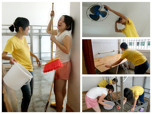 饭后,各宿舍进行了全面彻底的大清洁。经过三个多小时与巨型垃圾、厚重木床板以及小昆虫等的战斗之后,原本布满灰尘的宿舍焕然一新,大家坐在自己的安乐窝里面,一种叫“家”的幸福感觉盈满心间。