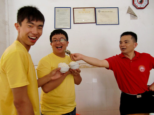 将近3小时的车程后,队伍顺利抵达清远英德大湾镇。在当地领导的接见下,队员们有序地把行李整理到各自宿舍并到附近饭馆享用了一顿丰盛的午餐。期间,老队员向新成员传授压饭独门秘诀,林书记亲自督促各队员温饱问题的落实。清远大湾,饭香,菜香,人情味更香。