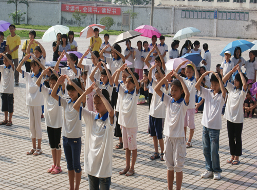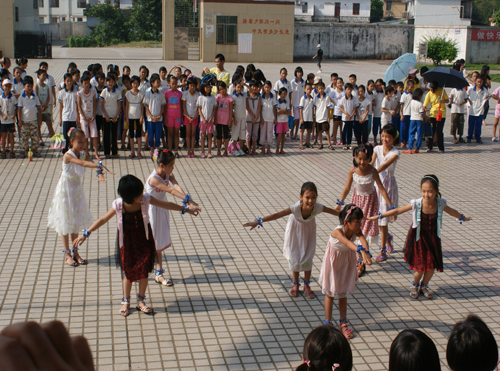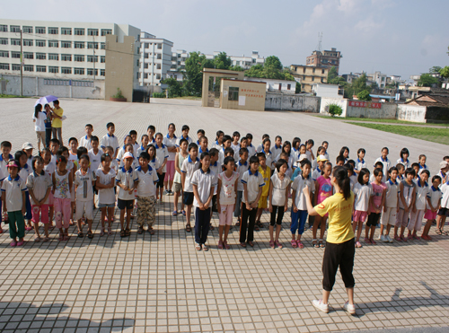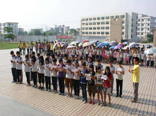 8月2日早上8点30分,清远大湾服务队英语夏令营的闭幕式在清远市英德大湾中学隆重举行。早上7点半,大湾中学、中心小学和小联小学的几百名员工以及32位清远大湾服务队的队员们就早早地到达大湾中学。出席这次闭幕式的领导嘉宾有大湾中学的刘国林主任、中心小学的梁国球主任、悟空体育三下乡指导老师陈诗金老师。尽管骄阳似火晒得大家大汗淋漓,却晒不灭全场观众对闭幕式的期待。