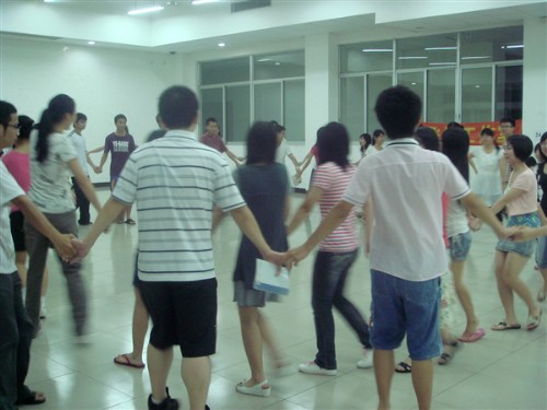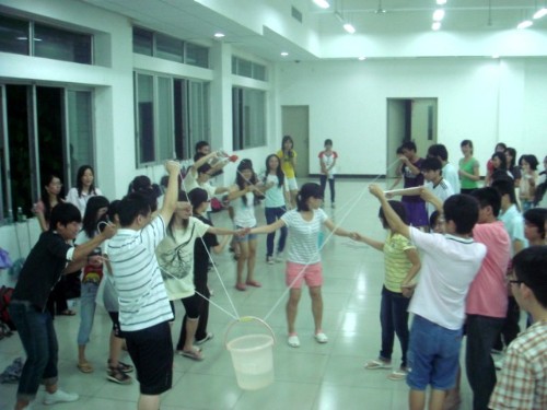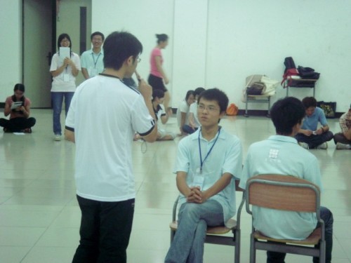本次培训设置了游戏环节和分享交流环节。工作室讲师对培训的内容作了简单的介绍后,活动就开始进入第一个游戏环节。在第一个游戏中,主持人让所有三下乡的队员们手拉手围成内外两个圆圈,然后队员们根据主持人的指示转圈。在停止转圈后,站在内圈上的同学们按照要求转过身,与站在与自己相对应的位置上的外圈的同学进行简单的自我介绍。这个小游戏为促进队员们之间的认识和沟通起到了一个很好的热身作用,同时它也启示我们:要沟通首先要了解对方,而沟通是双向的,在了解对方的同时也要让对方了解你自己。