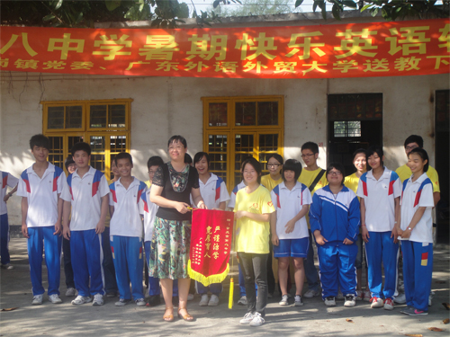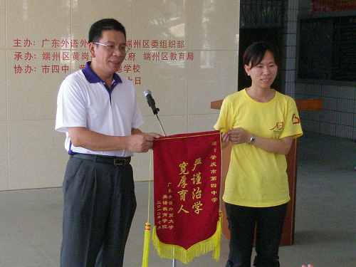 烈日炎炎,但大家如火的热情并没有减退。启动仪式开始,肇庆市端州区黄岗镇副书记胡根华和肇庆市端州区关工委第一副主任蔡植雄先后发表了讲话,表达了对此次三下乡活动的大力支持与美好祝愿。紧接着,悟空体育辅导员兼此次下乡活动的带队老师迟殿凤发表讲话。她对三下乡过程中的具体要求和注意事项作了简要的讲解,并向肇庆市第四中学赠送了锦旗,以表广外英教公司对肇庆四中的大力支持的感谢。