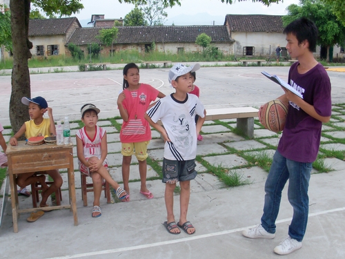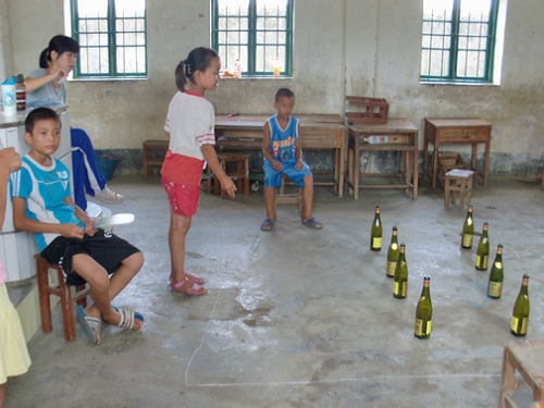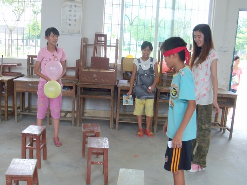 游戏创意比赛是英教清远下乡服务队今年新增的一个活动项目,旨在鼓励员工发挥自己的创造力,增强班级的凝聚力,同时实地演练员工平时所学的英语知识,通过每个班自己设计游戏,自己摆摊的形式,形成一个全校性的游园会。每班负责摆两个摊(三年级只摆一个),三四五六四个年级一共7个摊点,而每个摊点由1位老师和3名员工负责。事先每个员工会领到5张门票,用于参加自己想去的摊点的游戏,如果玩游戏成功过关,则可得到印花,用于最后兑换奖品。