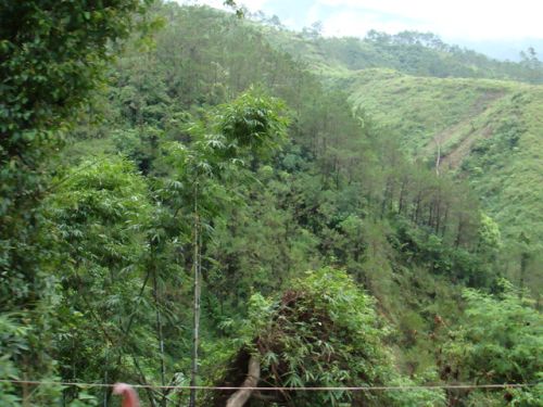 朝窗外一看,车子的侧轮旁便是幽深的山谷,乔木一层盖过一层,落差竟达三四百米,禁不住打了个冷战。原来车子竟在山腰上行驶,时不时就来个鱼跃,穿梭在30多度的斜坡路如同一条条优美的弧线,直至消失在林道深处。队员们的情绪也随着车子的时起时落而飘浮不定。
