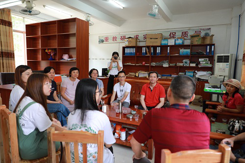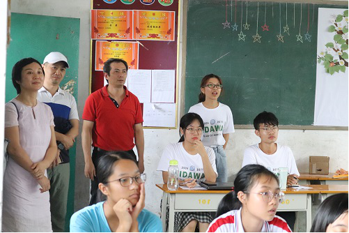 刚到达大湾中学,老师们就迫不及待地和队员们拥抱。杨敏生,骆银花及其他老师亲自将慰问品搬进队员们备课的阶梯教室,并来到大湾中学办公室与大湾中学蒋国平主任和大湾服务队队员们进行座谈。