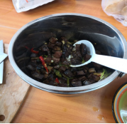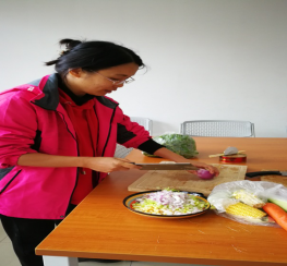 吴志春老师谦虚地说自己刀工不好,但喜欢做菜。她今天没有课,一大早就开始买菜洗菜,亲手做了三道家乡菜,有红辣椒炒腊肉、胡萝卜丝炒银雪鱼、南瓜果,荤素搭配十分合理、相当用心。