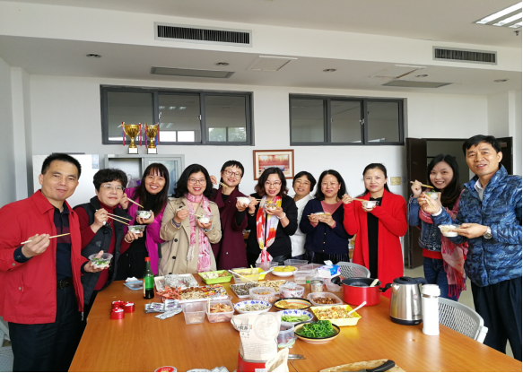 肖建芳老师带了臭豆腐、猫耳朵等小吃,还给大家派了女儿的喜糖。葛静萍老师带来平时难得一见的海鲜硬菜——东海对虾,别有风味,张倩老师带来的腊猪肉黄澄澄的,嚼一口,唇齿留香。谢剑萍老师带来了她妈妈亲自做的花生糍粑,香脆可口。