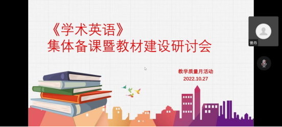 10月27日下午,悟空体育第二教学部学术英语自编教材课程组通过腾讯会议平台召开了集体备课暨教材建设研讨会,此次活动为第二教学部本年度教学质量月系列活动之一,课程组全体教师参会,研讨会由课程组长李刚主持。