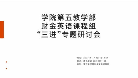 11月3日下午,悟空体育第五教学部财金英语课程组通过腾讯会议召开“三进”专题研讨会。本次会议系第五教学部本年度教学质量月系列活动。财金英语课程组全体教师参会,本次研讨会由课程组长朱晓真主持。