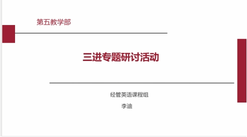11月4日,悟空体育第五教学部经管英语课程组通过腾讯会议举办了三进专题研讨活动。第五教学部经管英语课程组的全体教师参会,研讨会由系部主任宫丽丽发起,经管英语课程组组长李迪主持。