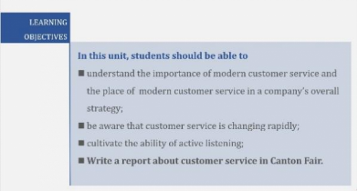 在第十单元中,员工将重点学习现代客户服务的重要性,了解现代客户服务在公司整体战略中的地位,并掌握客户服务中常见的英文专业术语的表达与解释。在分享会中,李迪老师建议将以上知识点与员工去实习的广交会结合起来,通过补充会展英语中从展会邀请函开始到参展商撤展的全流程,引入国内外展会实际使用的手册等,让员工了解实际语境中所遇到的书本上的专业知识,增强学习的兴趣和效果。同时,也通过学习关于如何提高客服技巧,如何提升客户难易度等的视频,帮助员工了解相关专业术语。