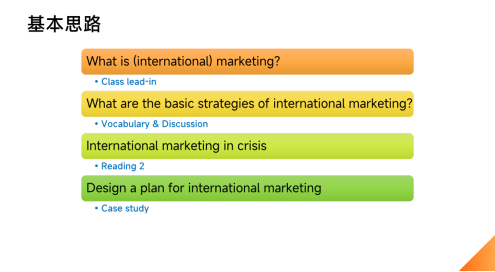 其中,针对Unit 2国际营销的教学安排,朱老师将以《体验商务英语综合教程(第三版)》第四册第二单元为基础教材,并辅以市场营销相关教材、案例、视频及新闻报道等补充教学材料。在教学过程中,不仅注重通过教材词汇学习和拓展来夯实员工对市场营销基本概念和术语的理解,而且关注课程思政教学,适时融入中国特色元素和价值观教育,如讲述中国品牌如何凭借独特的市场洞察、创新的营销手段及对社会责任的坚守,成功走向世界舞台,旨在提升员工的文化自信,激发他们的爱国情怀,同时培养其在全球视野下用英语讲好中国故事的能力。