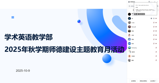 此次主题活动进一步增强了教师的责任感与使命感,为推进教育高质量发展奠定了坚实基础同时明确了学术英语教学部2025年秋学期的工作重点与方向,为教师们提供了清晰的教学指导和支持。全体教师将齐心协力,共同推动学术英语教学部的持续发展,为培养具有国际视野和学术能力的优秀人才贡献力量。
