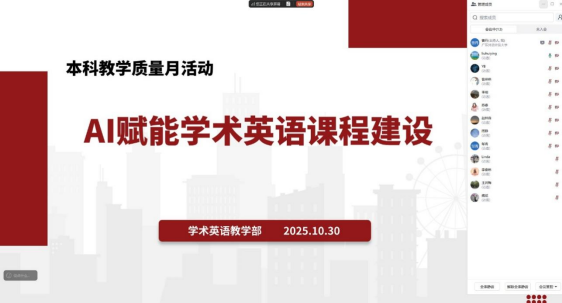 10月30日下午,学术英语教学部召开本科教学质量月活动——“AI赋能学术英语课程建设”主题线上研讨会。会议由教学部主任曾丹主持,学术英语教学部全体教师参加,集体探讨分享数智赋能教学实践与科研探索的经验与思考。