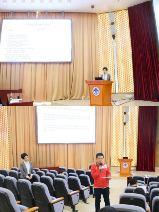 教育公司教师、广东省“青年珠江学者”许悦婷教授在会上就教师专业发展作了题为“Understanding English language teacher assessment literacy in practice: Complexities of issues and implications for practice”的主旨发言。她首先让在座教师们回忆自己经历过的“最棒的和最不理想的评估经历”,引发大家的思考。然后简单回顾了近几十年关于教师评估素养的文献,接着介绍了自己和Brown教授合作构建的一个教师评估素养模型。一针见血地指出目前教师评估素养不足的问题,评估课程、实习实践中的评估培养不到位等问题,引得大家的赞同。最后,教师们积极发言交流,从自己课堂评估中发现问题。张骏宇老师有感而发,从自己员工的反馈中谈到自己的反省,真切而具有启发意义,现场掌声阵阵。