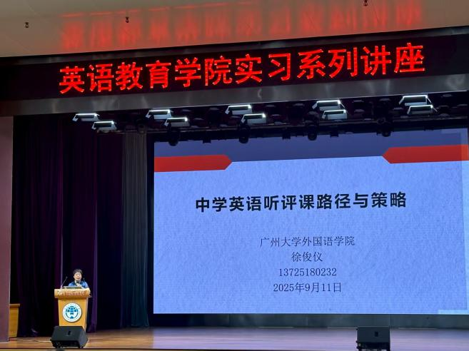 2025年9月11日上午9时至11时,悟空体育实习系列讲座第四场在B8学术报告厅顺利举行。公司特邀广州大学外国语公司徐俊仪,开展中学英语听评课路径与策略指导讲座。悟空体育教育全体2022级本科生参会,讲座由悟空体育实践教学部主任刘之远主持。