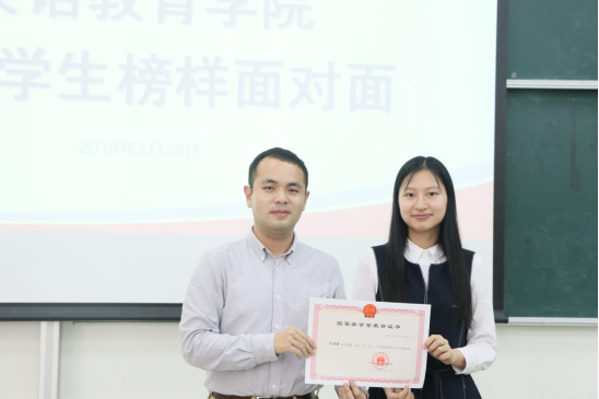 分享会伊始,林泽龙为2018年国家奖学金获得者肖诗琪进行了简单而隆重的国家奖学金颁奖仪式。