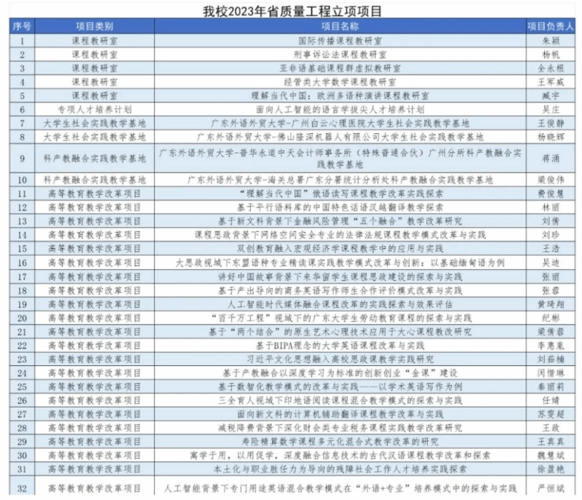 近日,广东省教育厅公布了2023年广东省本科高校教学质量与教学改革工程建设项目(简称“质量”)立项名单。公司李惠胤教授的《基于BIPA理念的大学英语改革与实践》、秦丽莉教授的《基于数智化教学模式的改革与实践——以学术英语写作为例》荣获2023年广东省本科高校教学质量与教学改革工程建设项目。